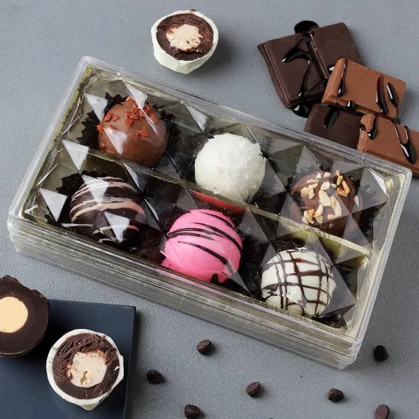 A delicious handcrafted collection of gourmet flavours, this box of 6 chocolate truffles is premiumness personified. Each triple-layered truffle is a bang of flavour. Collection of Hazelnut, Coconut, Orange, Strawberry, Dulce de Leche and Mixed Fruit flavours Key attributes :
